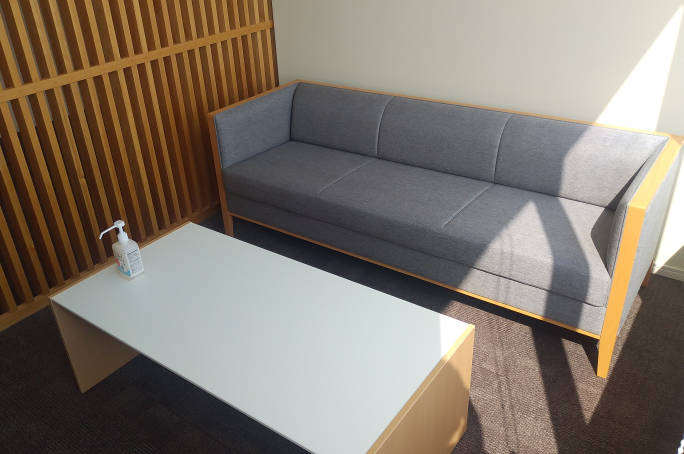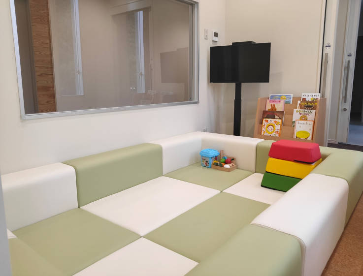 待合ロビーから室内を確認できます。子供向けのDVDの視聴や絵本、またお子様用トイレも備えております。